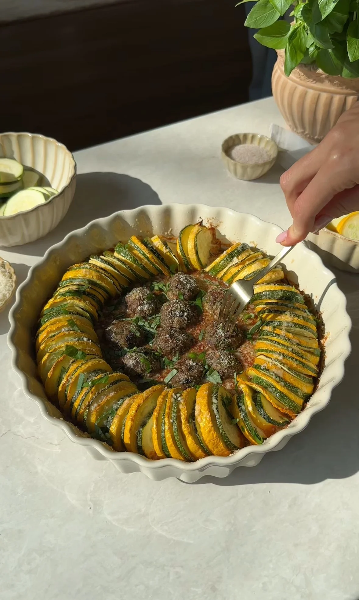 Doe wat tomatensaus in een grote ovenschaal. Plaats de courgette en balletjes hierin. Strooi er wat extra kaas over.