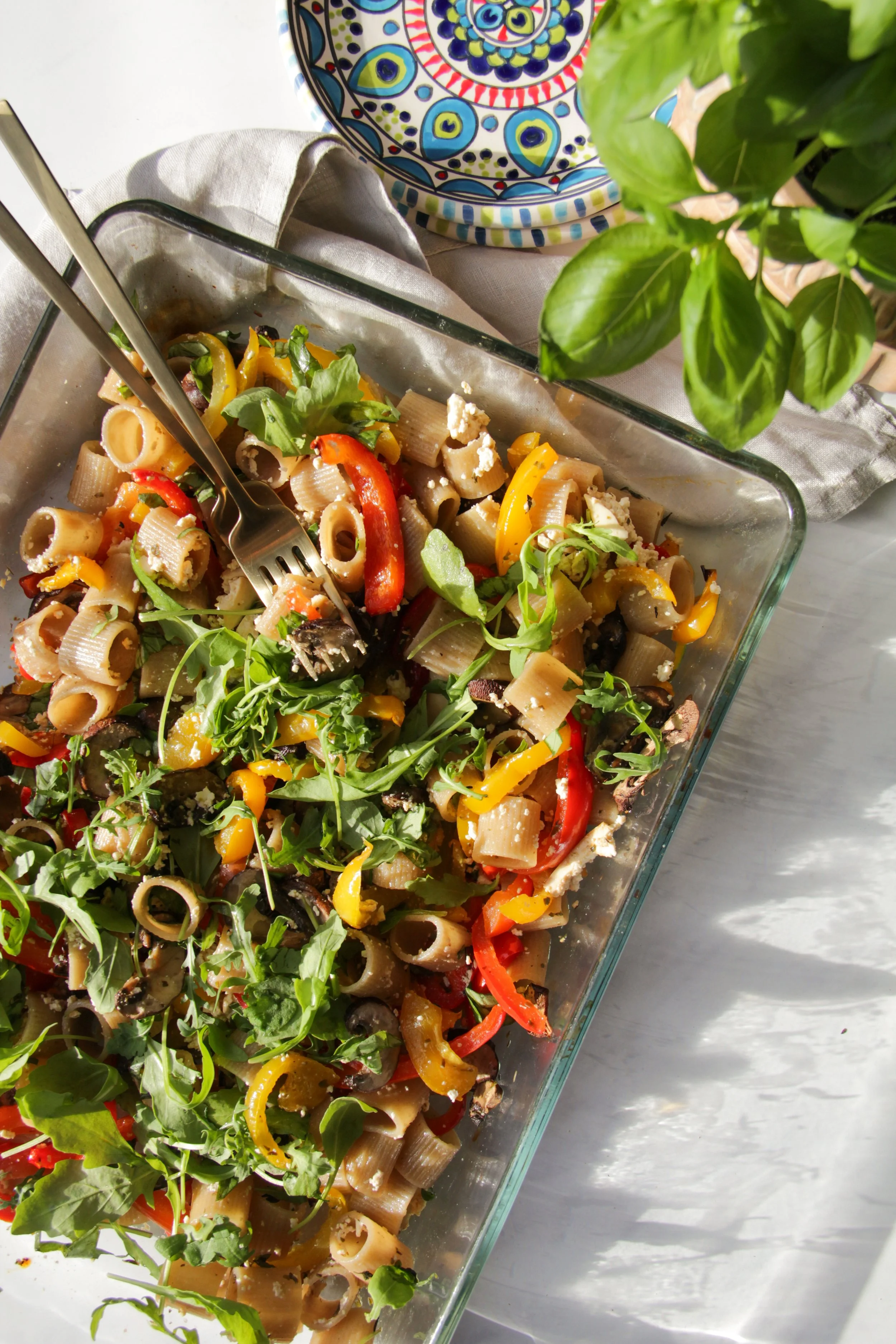 Haal de paprika en feta uit de oven. Voeg oregano, lookpoeder en peper toe naar smaak. Plet de feta met een lepel. Voeg de champignons en pasta toe. Meng goed onder elkaar. Werk af met rucola en wat Parmazaanse kaas voor de smaak.